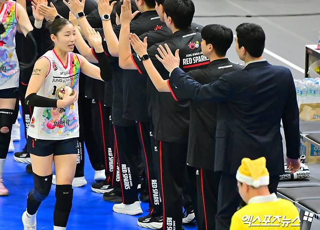 25일 오후 경기도 수원실내체육관에서 열린 '진에어 2025-2026 V-리그' 현대건설과 정관장의 경기, 현대건설이 풀세트 끝 정관장에 세트 스코어 3-2(25-20 24-26 14-25 25-19 15-12) 역전승을 달성하며 7연승을 기록했다.