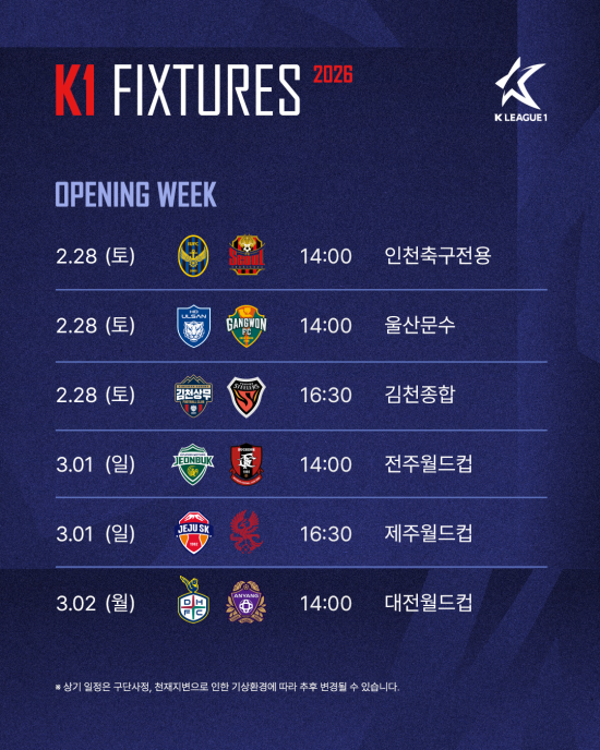 한편, 이번에 발표한 2026시즌 K리그1 일정은 2025-2026시즌 아시아축구연맹(AFC) 챔피언스리그(ACLE, ACL2) 참가팀 일정에 따라 조정 및 순연될 수 있다.