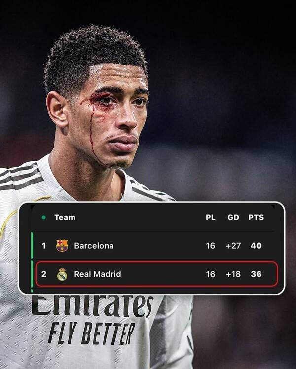 실점 직후 레알에 더 큰 악재가 덮쳤다. 주드 벨링엄이 보르하 이글레시아스와의 경합 과정에서 팔꿈치에 얼굴을 스치며 눈썹 아래가 깊게 찢어지는 부상을 입은 것이다. 피는 그의 얼굴을 타고 흘러내렸고, 결국 치료를 위해 그라운드를 떠날 수밖에 없었다.