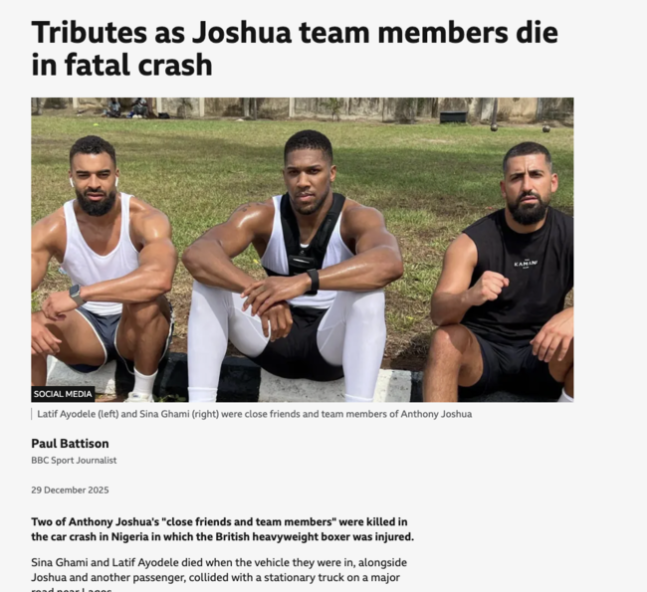 조슈아는 지난 달 29일 휴가차 찾은 나이지리아에서 동료 2명을 잃는 교통사고를 당했다. 숨진 인물은 시나 가미와 라티프 아요델레다. 두 사람 모두 조슈아와 오랜 기간 함께해 온 측근으로 알려졌다.