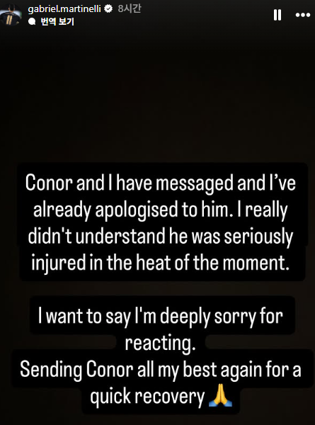 (MHN 권수연 기자) 아스날의 가브리엘 마르티넬리가 부상 입은 상대 선수를 무자비하게 밀어낸 행동에 대해 사과했다.