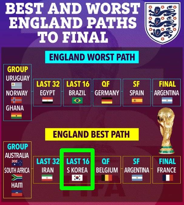 매체가 원하는 베스트 시나리오는 잉글랜드가 북중미 월드컵 조별리그에서 호주, 남아프리카 공화국, 아이티와 한 조에 묶이는 것이다. 이후 32강에서 이란을 상대하고, 16강에서 대한민국을 만나길 희망했다.