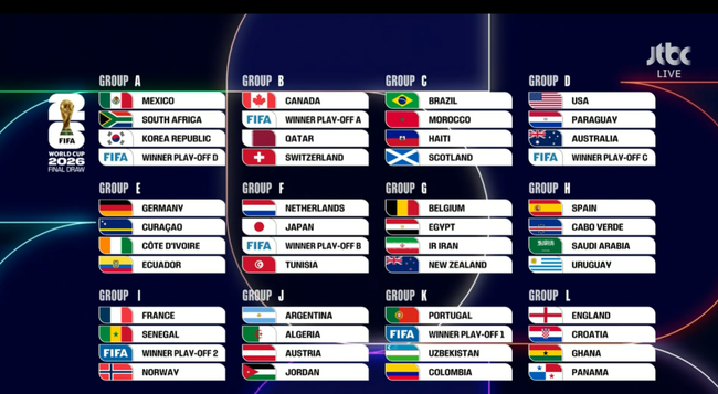 FIFA는 6일(한국시간) 오전 2시 미국 워싱턴DC 케네디센터에서 2026 국제축구연맹(FIFA) 월드컵 본선 조추첨을 진행 중이다. 총 42개국이 본선 진출을 확정한 가운데, 남은 6장의 티켓은 내년 3월 유럽예선 플레이오프와 대륙 간 플레이오프를 통해 결정될 예정이다.