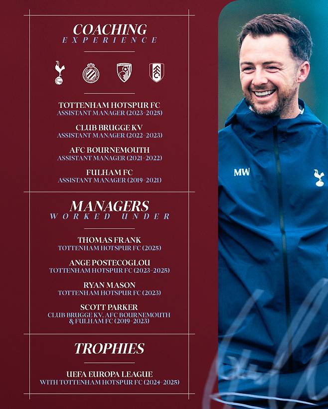 [골닷컴] 강동훈 기자 = 잉글랜드 프리미어리그(EPL) 토트넘에서 코치로 지내던 맷 웰스(37·잉글랜드)가 2015년 처음 지도자 길을 걷기 시작한 이후 처음으로 프로 사령탑으로 부임했다. 미국 메이저리그사커(MLS) 콜로라도 래피즈 지휘봉을 잡았다. 웰스의 콜로라도 래피즈행에는 토트넘 시절 함께 했던 손흥민(33·로스앤젤레스 FC)의 조언이 있었던 것으로 전해졌다.