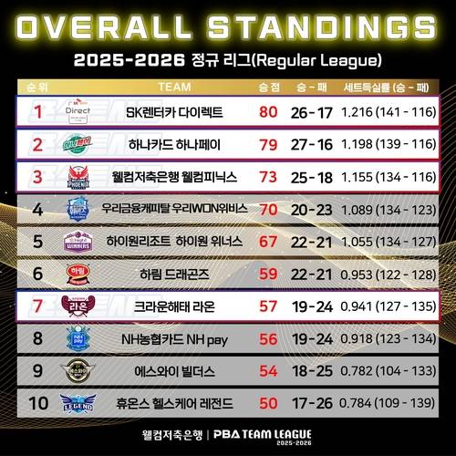 두 팀이 동시에 승점을 쌓지 못하면서 1위 SK렌터카(26승 17패·승점 80)와 2위 하나카드(27승 16패·승점 79)의 격차는 여전히 승점 1이다. 포스트시즌 파이널 직행 티켓이 걸린 정규리그 1위의 주인은 남은 2경기 결과로 결정된다.