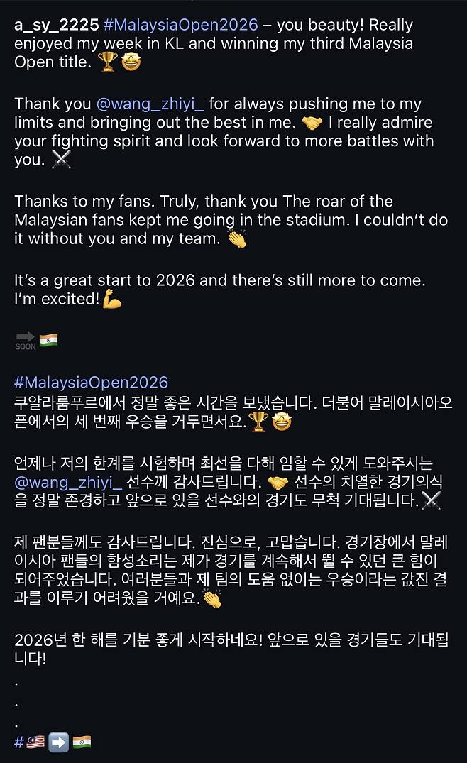 (엑스포츠뉴스 윤준석 기자) '셔틀콕 여제' 안세영(삼성생명)이 말레이시아 오픈 3연패를 달성한 직후 개인 SNS를 통해 우승 소감을 남겼다.