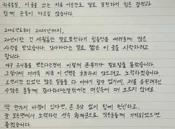 황재균은 SNS에 자필 편지 사진을 게재했다. 그는 "오늘 저의 30년 야구인생에 종지부를 찍게 되었습니다. 하루종일, 이 글을 쓰는 지금 이 순간도 말로 표현하기 힘든 감정과 함께 눈물이 마르질 않습니다"라며 "2006년도부터 2025년까지, 20년이라는 긴 세월 동안 말로 표현하기 힘들 만큼 여러분께 많은 사랑을 받았습니다"라고 자신의 야구인생 30년, 프로인생 20년을 되돌아봤다.