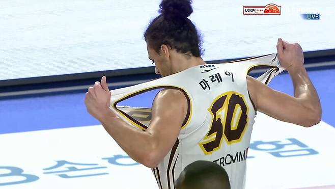 마레이는 전반 종료 직전 골밑슛을 놓치고 팁인까지 실패했다. 그러자 갑자기 유니폼을 찢었다. 자신의 경기가 풀리지 않는 분풀이로 보인다.