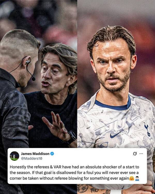 매디슨은 지난 14일(한국시간) 웨스트햄 유나이티드와의 프리미어리그 4라운드를 지켜보던 중, 크리스티안 로메로의 선제골이 VAR 검토 없이 취소되자 분노를 감추지 못했다.