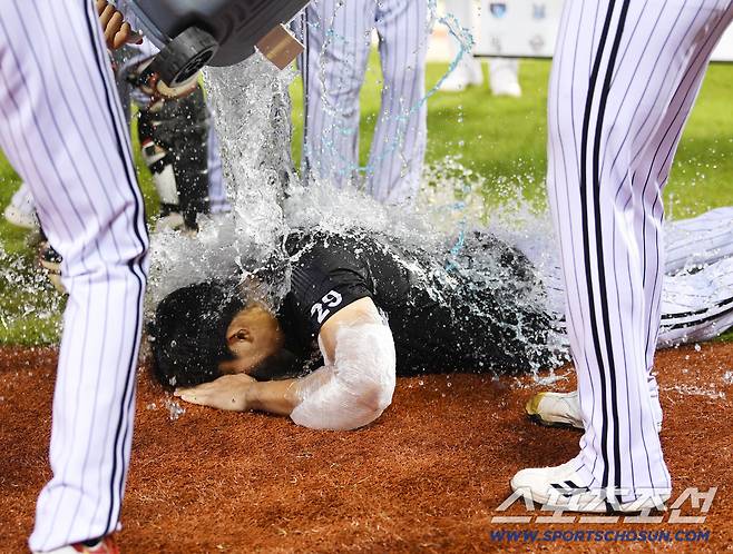 손주영의 반응도 특별했다. 임찬규의 짓궂은 장난에도 미동 없이 무사히 인터뷰를 마친 손주영은 도망치지 않고 그대로 그라운드에 엎드려 물세례를 받아냈다. 망치까지 든 유영찬의 겁박이 제대로 통한 셈이다.