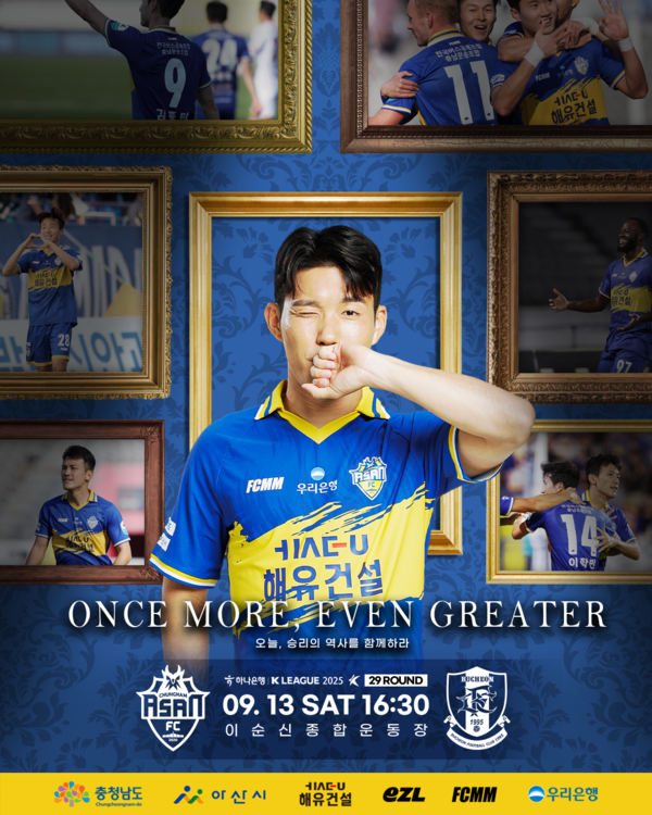 충남아산프로축구단(구단주 오세현, 대표이사 이준일, 이하 충남아산FC)이 오는 13일(토) 오후 4시 30분, 이순신종합운동장에서 부천FC1995(이하 부천)를 상대로 '하나은행 K리그2 2025' 29라운드 홈경기에 나선다.