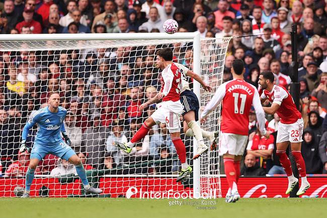 아스널 공격은 이어졌다. 전반 21분 마두에케 크로스를 요케레스가 헤더로 연결했는데 벗어났다. 전반 27분 에제 슈팅은 득점에 실패했다. 전반 29분 팀버의 결정적 슈팅은 셀스가 선방했다.