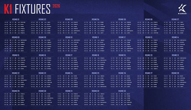 한편, 이번에 발표한 2026시즌 K리그1 일정은 2025~2026시즌 아시아축구연맹(AFC) 클럽대항전 참가 구단 일정에 따라 조정 및 순연될 수 있다. 이 밖에도 K리그1 정규라운드 33라운드를 마친 후에는 파이널라운드에 돌입하게 된다. 파이널라운드는 34라운드부터 38라운드까지 구단별로 5경기씩 치르게 되며, 해당 경기 일정은 정규라운드를 모두 치른 후에 공개된다.