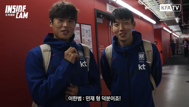경기가 끝난 뒤 대한축구협회 ‘인사이드 캠’을 통해 경기 소감을 이야기한 이한범과 김주성. FC서울에서 각각 덴마크 미트윌란, J리그 산프레체 히로시마에서 좋은 활약을 보이고 있는 두 선수에게 김민재는 ‘우상’이었다. 김민재와 처음 호흡을 맞춘 두 선수는 찬사를 아끼지 않았다.