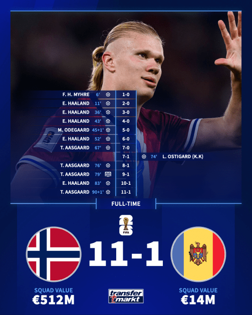 노르웨이는 10일(한국시간) 노르웨이 오슬로 울레볼 스타디온에서 열린 몰도바와 2026 월드컵 유럽 예선 I조 6차전에서 11-1 대승을 거뒀다. 노르웨이는 5경기 전승으로 선두에 올랐고, 2위 이탈리아(4경기 3승 1패·승점 9)와 격차를 승점 6으로 벌렸다. 몰도바는 5경기에서 무려 25실점을 내주며 전패했고, 최하위로 처졌다.