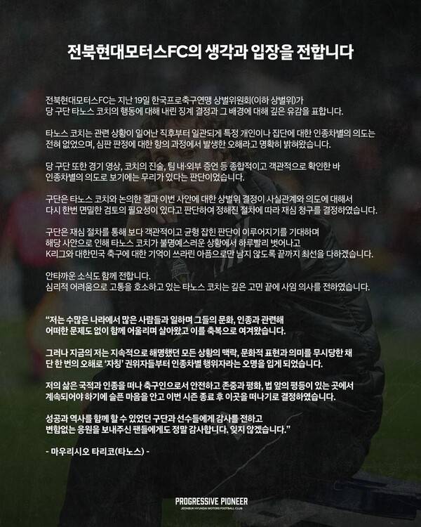 이어 전북은 심리적 고통을 호소하던 타노스 코치가 결국 사임 의사를 전했다는 안타까운 소식도 전했다. 타노스 코치는 "수많은 나라에서 다양한 사람들과 일하며 인종·문화와 관련해 어떠한 문제도 없었다"며 "이번 사안은 오해에서 비롯된 것이며, 단 한 번의 상황이 '인종차별 행위'로 단정지어진 데 큰 상실감을 느낀다"고 밝혔다. 그는 시즌 종료 후 한국을 떠나기로 결정했다고 전했다.