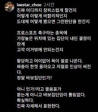 결국 타노스 코치가 사임에 이르자, K리그 해설위원이자 유튜브 채널을 통해 팬들과 소통해온 이주헌 해설위원 또한 강한 유감을 표했다.