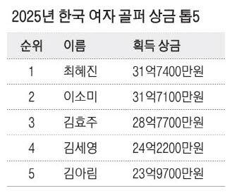 2025시즌 미국과 한국 등에서 주요 투어 일정이 마무리된 가운데 올해 상금으로 재미를 본 여자 골퍼는 주로 미국여자프로골프(LPGA) 투어에서 뛴 선수들이었다. LPGA 무대에서 시즌 상금 100만달러(약 14억6500만원) 이상을 기록한 한국 선수는 모두 8명이었다. 올해 한국여자프로골프(KLPGA) 투어에서 13억4152만원의 상금을 획득해 상금왕을 달성했던 홍정민보다 더 번 셈이다.