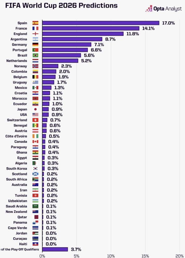 옵타는 “아르헨티나가 2연속 우승에 도전하는 가운데, 2022년 준우승팀 프랑스와 유로 2024 우승팀 스페인이 강력한 경쟁자”라며 “잉글랜드, 브라질, 포르투갈도 배제할 수 없고, 엘링 홀란이 이끄는 노르웨이 역시 주목할 만한 팀”이라고 평가했다.