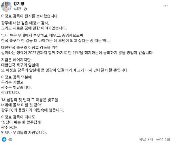 강기정 시장은 "이정효 감독이 떠나도 '심장이 뛰는 한 광주답게' 광주 FC는 언제나 우리들의 자랑이다"라며 변함없는 지지를 호소했다.