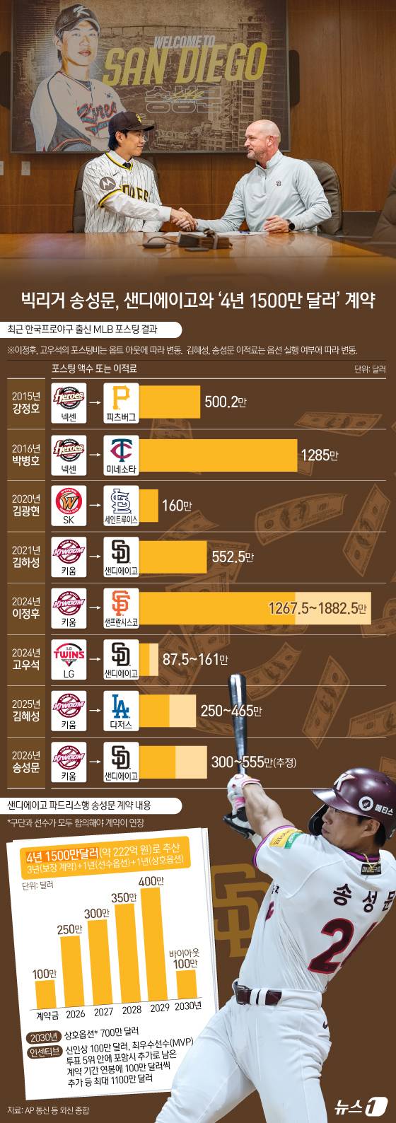(서울=뉴스1) 양혜림 디자이너 = '빅리거' 송성문(29)이 메이저리그(MLB) 샌디에이고 파드리스 입단이 공식 확정됐다. 샌디에이고 구단은 23일(한국시간) "내야수 송성문과 2029시즌까지 4년 계약을 맺었다"고 공식 발표했다. 송성문은 계약금 100만 달러를 받고, 2026시즌 연봉 250만 달러를 수령한다. 여기에 2027시즌 300만 달러, 2028시즌 350만 달러를 보장받는다.