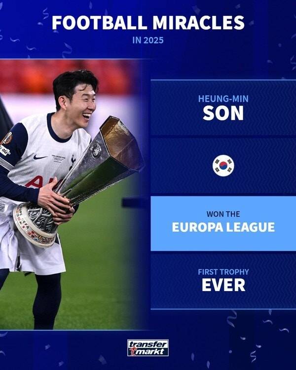 유럽축구전문매체 ‘트랜스퍼마크트’는 26일(한국시간) 공식 채널을 통해 ‘2025년 축구계에서 일어난 기적적인 순간 8가지’를 선정해 발표했다. 이름만 들어도 놀라운 사건들이 줄줄이 나열된 가운데, 유독 시선을 끄는 항목이 있었다. 팀도, 국가도 아닌 한 명의 선수. 바로 손흥민이었다.
