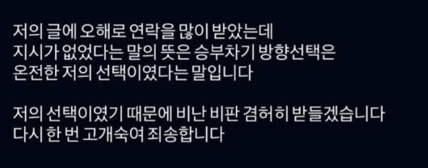 여기서 끝이 아니었다. 황재윤은 약 4시간 뒤 다시 해명글까지 올렸다. 그는 "저의 글에 오해로 연락을 많이 받았다. 지시가 없었다는 말의 뜻은 승부차기 방향 선택은 온전한 저의 선택이었다는 말"이라며 "제 선택이었기 때문에 비난과 비판 겸허히 받아들이겠다. 다시 한번 고개 숙여 죄송하다"라고 밝혔다.