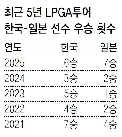 한국 여자골프 선수들은 지난해 미국여자프로골프(LPGA)투어에서 6승을 합작했다. 2024년(3승)보다 우승이 두 배나 많았다. 하지만 최다 우승국은 최근 빠르게 성장 중인 일본(7승)이었다. 1998년 LPGA투어에 진출한 박세리(49)와 ‘박세리 키즈’ 박인비(38) 등의 활약을 앞세워 LPGA투어를 지배하다시피 하던 한국이 일본보다 우승 횟수가 적었던 건 1996년 이후 29년 만이었다.