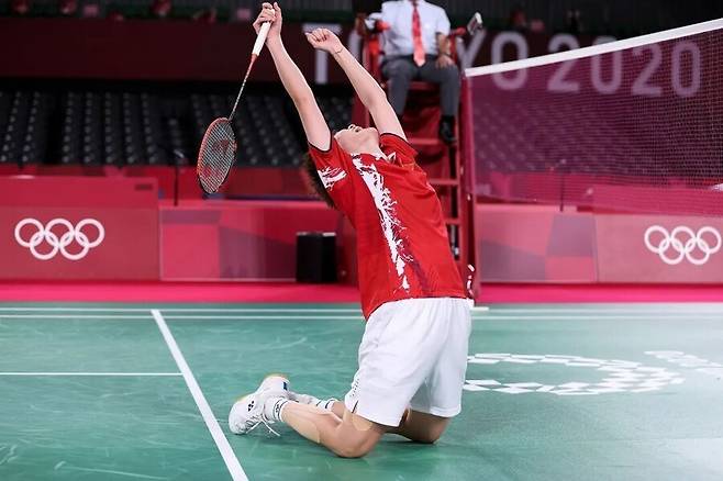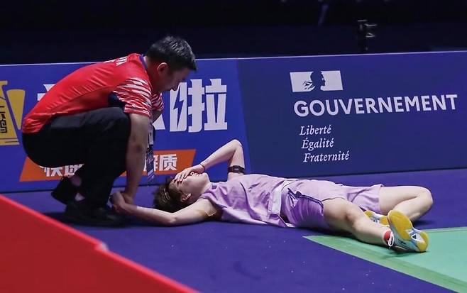 그리고 끝내 21-17로 경기를 마무리했다. '숙적' 안세영(삼성생명)을 꺾었다. 경기 직후 천위페이는 무릎을 꿇고 그대로 바닥에 쓰러졌다.