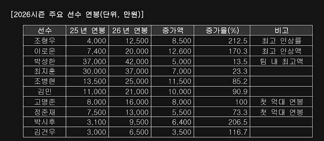 그 외에도 지난 시즌 69경기 5승4패 30세이브 평균자책점 1.60을 기록하며 리그 최고 마무리 투수로 활약한 조병현은 1억 3500만원에서 2억 5000만원(85.2%)으로 연봉이 인상됐다. 트레이드 이적 후 70경기(63⅔이닝) 5승2패 1세이브 22홀드 평균자책점 2.97을 기록한 김민은 1억 1000만원에서 1억원(90.9%) 인상된 2억 1000만원에 도장을 찍었다.