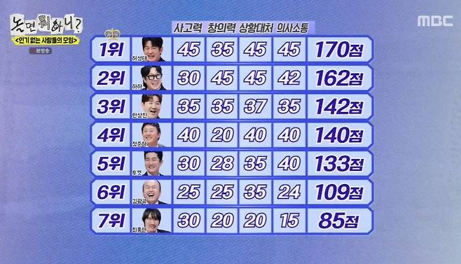 정준하는 허성태가 꼴등이란 말에 "어쩌다 그렇게 됐냐. 처음부터 거만 떨더니"라고 했고, 허성태는 "형한테 말 한마디 잘못해서"라고 반성했다. 이에 정준하는 "남한테 바가지 씌우면 잘못되는 거야"라고 잡도리를 시작해 웃음을 안겼다.
