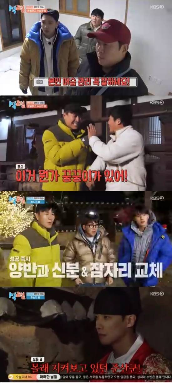 머슴인 김종민, 딘딘, 유선호는 밖에서 움막취침을 하게 됐는데 주종현PD는 양반 3인방에게 머슴 관리를 잘하라는 얘기를 했다.