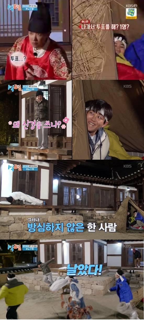 14일 방송된 KBS 2TV '1박 2일 시즌4'에서는 김종민, 문세윤, 조세호, 이준, 딘딘, 유선호가 '추노의 밤'을 보내는 모습이 전파를 탔다.
