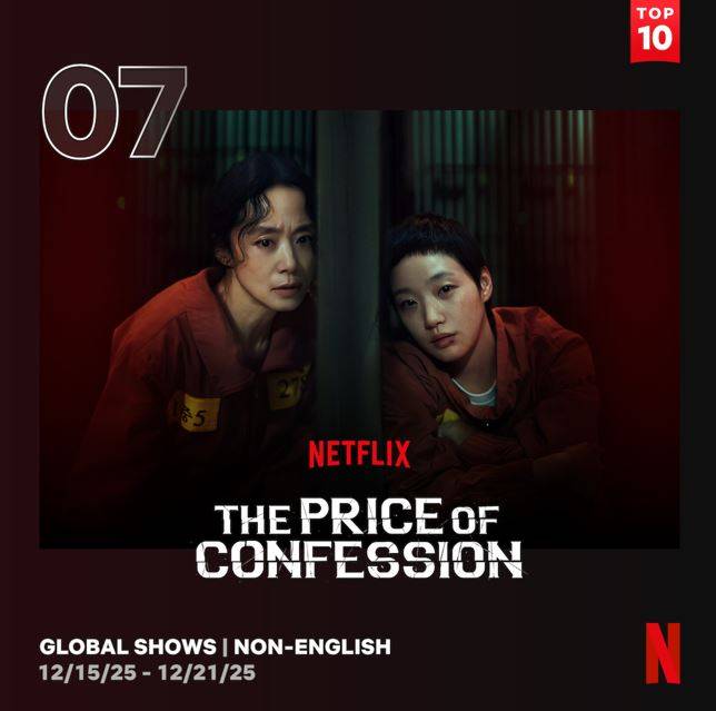 넷플릭스 시리즈 '자백의 대가'도 270만 시청수, 7위로 순위권을 유지했다. 남편을 죽인 용의자로 몰린 윤수와 마녀로 불리는 의문의 인물 모은, 비밀 많은 두 사람 사이에서 벌어지는 일을 그린 미스터리 스릴러다. 전도연, 김고은, 박해수, 진선규 등이 출연한다.