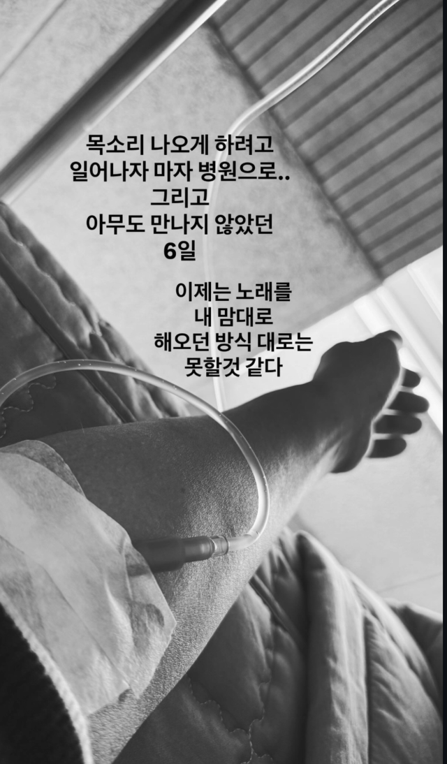 윤종신은 26일 자신의 SNS에 병원에서 링거를 맞고 있는 모습이 담긴 사진을 게재했다. 사진과 함께 그는 “목소리 나오게 하려고 일어나자마자 병원으로 갔다. 아무도 만나지 않았던 6일”이라며 “이제는 노래를 내 맘대로 해오던 방식대로는 못할 것 같다”고 덧붙였다.