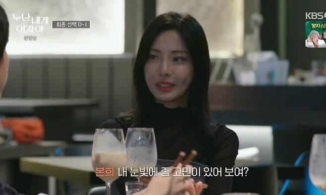 이날 무진의 밤 데이트 상대는 본희였다. 무진은 "낮에는 이야기 잘 했냐? 누구랑 이야기했냐"라며 본희의 낮 데이트 상대를 물었다. 본희는 "상현님이다. 따로 만난적은 없고 하우스에서만 얘기해봐서 얘기해 보고 싶었다고 하더라. (상현이) 되게 진지한데 오늘 이야기하길 잘했다고 생각했다"라고 솔직히 밝혔다.