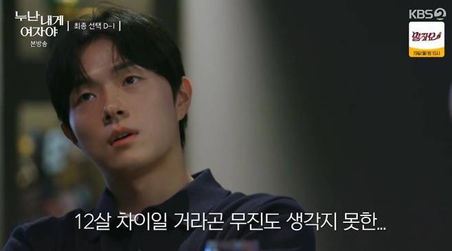 무진은 "내일이 마지막 날이다. 아쉽기도 하다. 재미있었는데"라며 아쉬움을 전했다. 그러면서 "어제 나이 공개할 때 안 떨렸냐"라고 물었다. 두 사람은 무려 띠동갑인 12살 나이 차이가 나는 상황. 이에 나이 공개 당시 본희는 충격을 받았다.