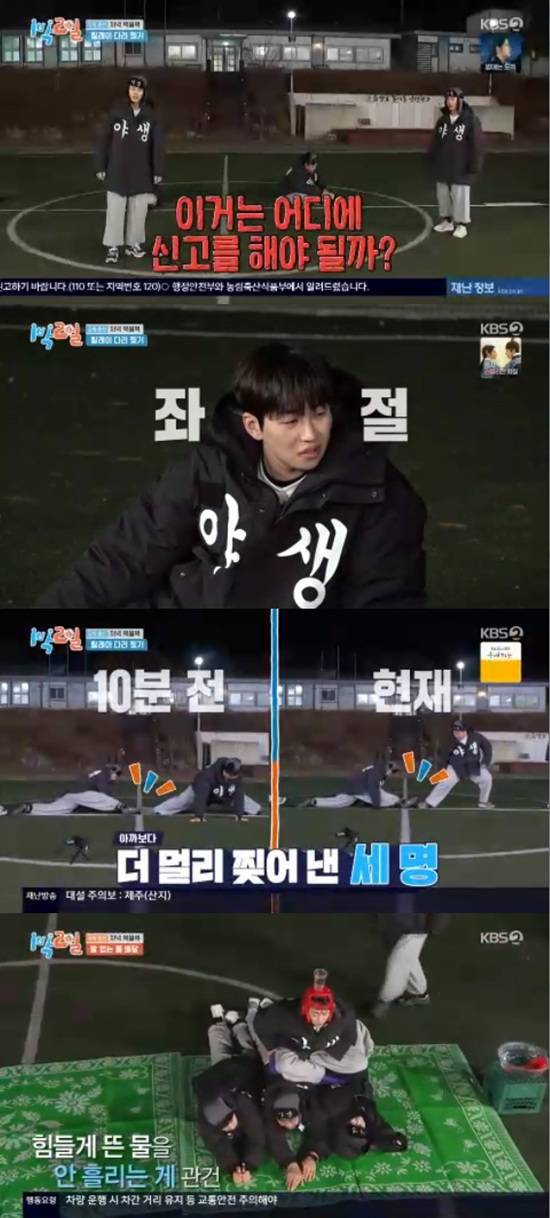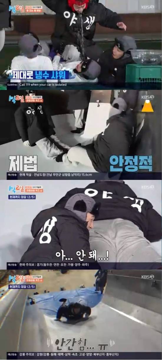 멤버들은 시간이 지날수록 경사가 올라가는 트럭 안에서 떨어지지 않고 퀴즈 다섯 문제를 맞혀야 했다.