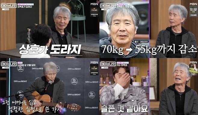 또한 “건강은 어떠신지?”라는 질문에 최백호는 5년 전 발병한 비결핵성 항산균 폐질환으로 15kg이 빠져 체중이 55kg이 됐으며 완치된 지금까지도 체중이 늘지 않고 있다고 털어놨다.