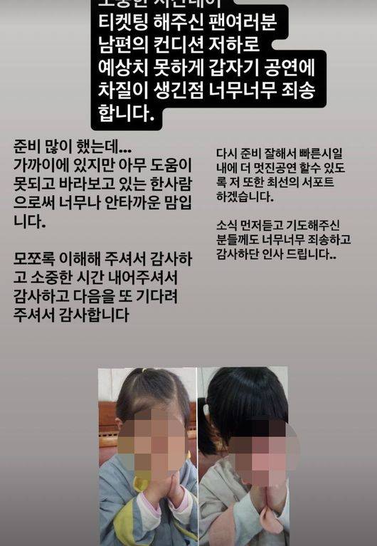 전미라는 25일 자신의 SNS 스토리를 통해 “소중한 시간 내어 티켓팅해주신 팬 여러분, 남편의 컨디션 저하로 예상치 못하게 공연에 차질이 생긴 점 너무 죄송하다”고 고개를 숙였다.