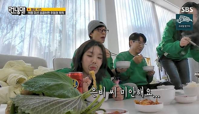 그런 가운데 유재석은 라면을 먹다 청하의 노래를 권은비의 노래로 착각하고 부르기 시작했다. 권은비는 "(제 노래) 아닌데요"라며 "제 것도 불러주실래요? 지금 불러주실래요? 지금 빨리 불러"라고 소리지르며 압박해 웃음을 안겼다. 결국 유재석은 "은비 씨 미안해요"라고 사과하며 권은비의 노래를 불렀다.