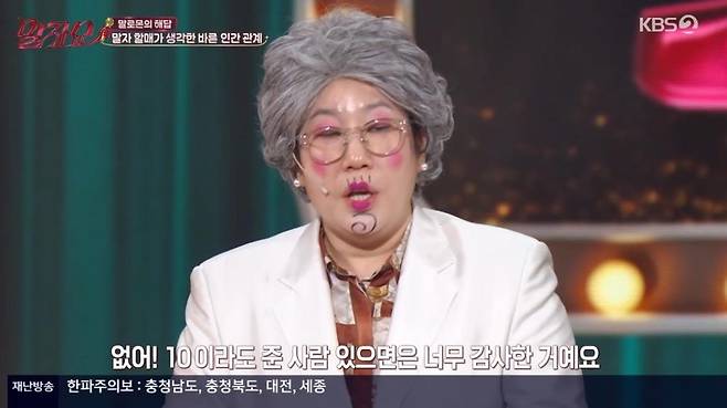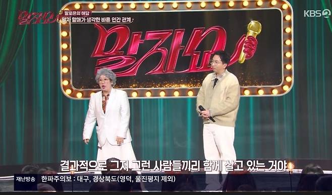 19일 방송된 KBS2 예능 프로그램 '말자쇼'에서는 '소통왕 말자 할매' 김영희가 촌철살인의 입담으로 관객들의 고민 타파에 나섰다.