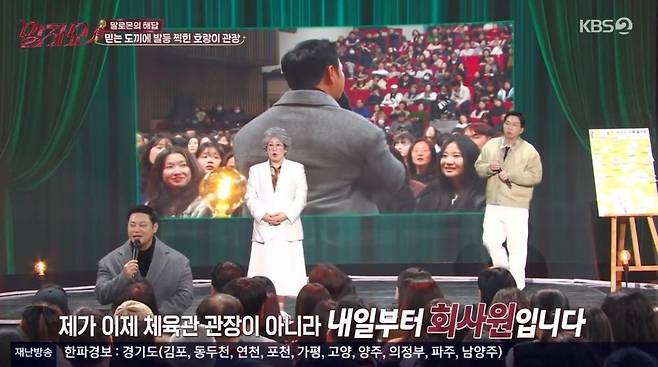양치승은 "체육관이 무너지니 더 좋은 기회가 오더라"라며 이제는 헬스장 관장이 아닌 신입사원이라고 밝혀 눈길을 끌었다. 그는 "용역회사에 가게 됐다. 대형 건물을 도맡아 관리하는 업체에서 커뮤니티 센터 관리를 맡게 됐다"라고 전해 박수를 받았다.