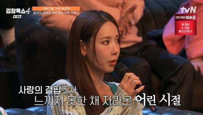 김창옥은 연예인이라는 직업 특성상 채은정의 불안정함에 공감하며 "기댈 곳이 없이 오래 산게 아닐까"라고 말했다. 채은정은 "엄마에 대한 사랑의 결핍이 없을 정도로 어릴 때부터 곁에 (엄마가) 안 계셨다. 엄마가 초등학교 3학년때 돌아가셨는데, 오랜 투병생활로 같이 지내지 못했다. 얼마 전에 아버지도 돌아가셨다. 아빠하고도 중학교때까지만 같이 살았다. 저는 받아본 사랑이 뭔지 잘 몰라서 어떻게 사랑을 줘야할지 잘 모르겠다"라고 고백했다.