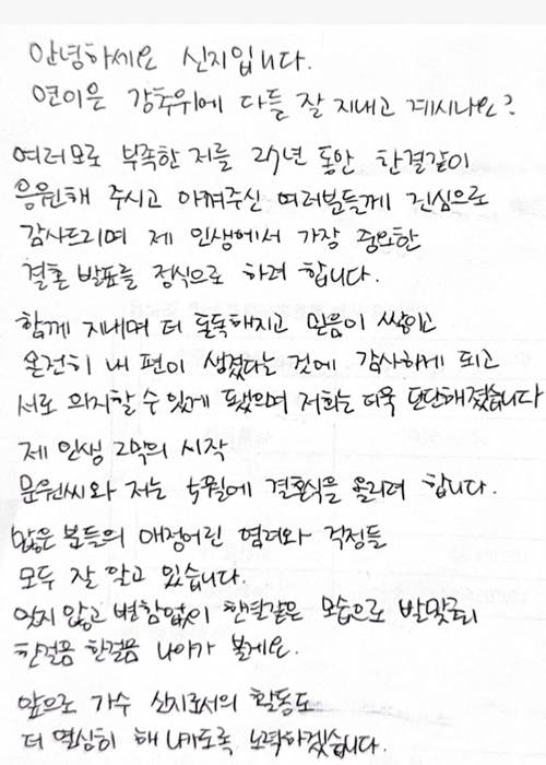 신지는 26일 자신의 SNS에 자필 편지를 공개하고, 오는 5월 2일 가수 문원과 결혼식을 올린다고 밝혔다. 지난해 6월 결혼 계획을 처음 언급한 이후 약 1년 만에 전한 공식 발표다.