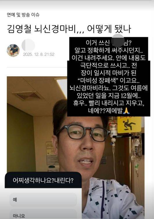 이에 김영철은 “이거 쓰신 분? 알고 정확하게 써주시던지.. 이건 내려주세요. 안에 내용도 극단적으로 쓰시고. 전 장이 일시적 마비가 된 ‘마비성 장폐색’이고요. 뇌신경마비라뇨”라고 적으며 잘못된 정보에 대해 지적했다.