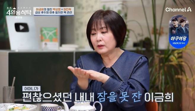 그런 가운데 이금희는 목 관리 비법에 관해 "작년까진 거의 안 했다"라고 말문을 열었다. 이금희는 "작년에 엄마가 크게 아프셔서 큰일 날 뻔한 적이 있었다"라며 "작년 8월 말 의식을 잃으시고, 중환자실에 계셨다. 우리 가족이 모두 다 어찌할 바를 몰랐는데, 다행히 엄마가 강인하셔서 이겨내셨다"라고 털어놓았다.
