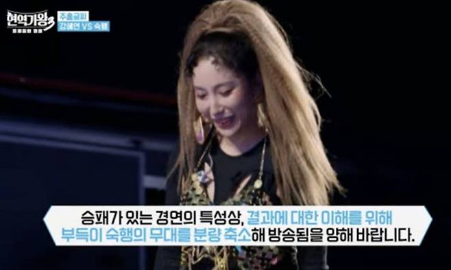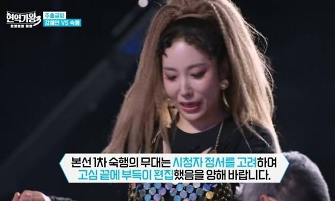 6일 방송된 '현역가왕 3'에서는 본선 1차 1대 1 대결 무대와 결과가 나왔다. 이날 동료 가수 강혜연은 본선 1차전 무대 대결 상대로 숙행을 지목했다. 숙행은 대기석에 앉아 있다 무대로 이동하는 모습까지 방송됐는데, 단독 샷이 잡히자 제작진은 자막으로 입장을 표명했다.