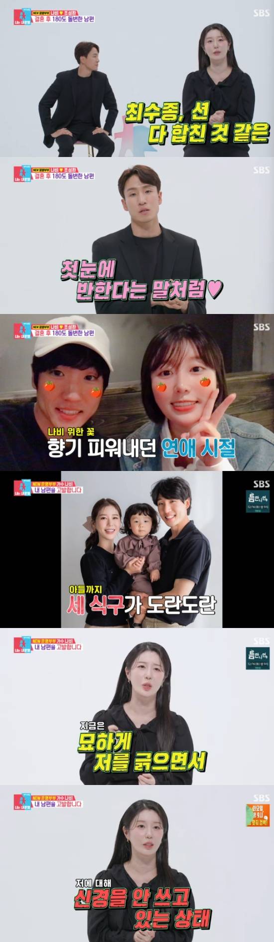 이날 방송에서 나비는 남편 조성환을 고발한다면서 "남편이 연애를 할 때는 최수종, 차인표, 션 선배님을 합쳐 놓은 것 같은 그런 사람이었다. 그런데 지금은 깐족이 베이스로 깔려있고, 저를 열받게 하는 것이 특기다. 저에 대해 신경을 안 쓴다"고 말했다.