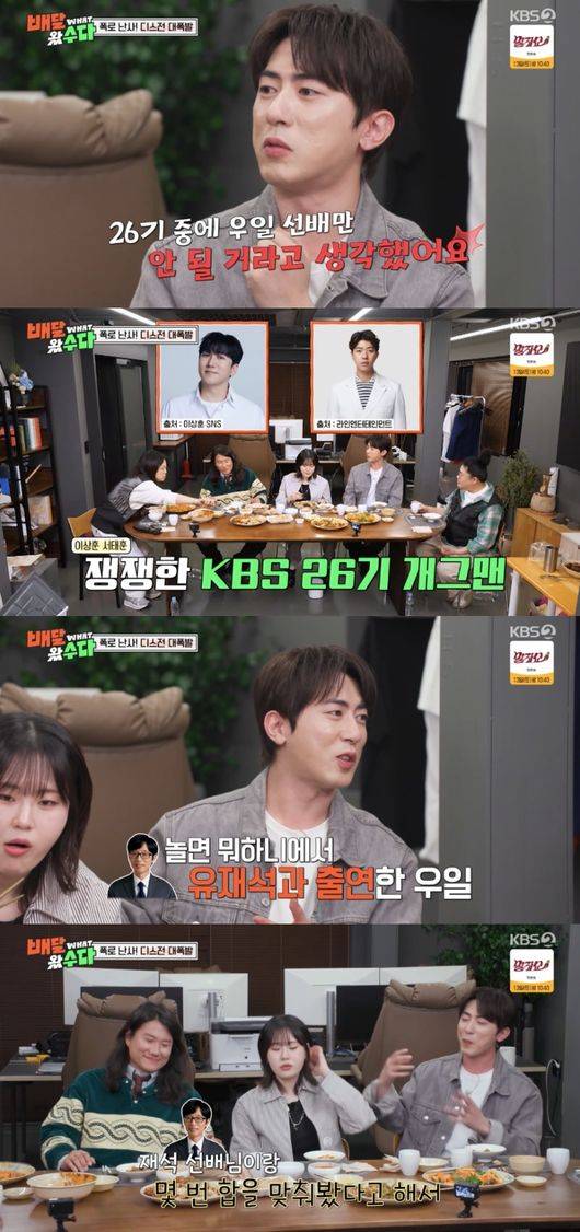 김숙은 “반대로 원훈이랑 지윤이는 우일 선배 잘 될 줄 알았냐”라고 물었다. 김원훈은 “26기 선배들 중에 우일 선배만 안 될 줄 알았다. 이상훈, 서태훈, 진짜 거기도 잘하는 분들 많은데 우일 선배가 그때 당시에 욕심이 엄청났다. 센 캐릭터 해서 ‘좀 과한데? 저 사람 좀 과하다’ 그렇게 생각했다”라고 팩폭을 날렸다.